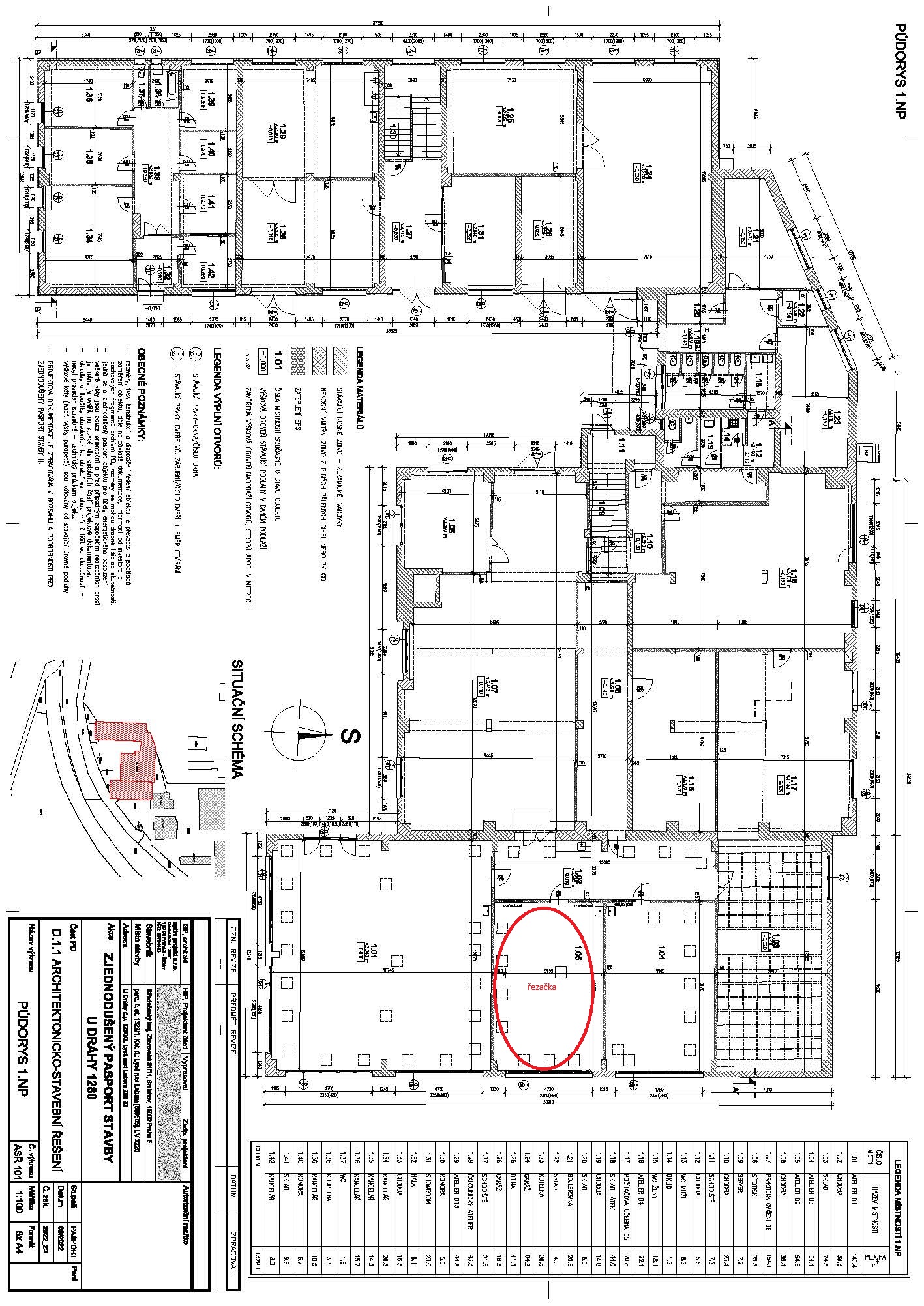 Řezačka bude umístěna v místnosti 1.05, limitujícím faktorem mohou být dveře a jeden vyšší schod do chodby (mezi 1.07 a 1.02) umístěné před učebnou. Viz výkres.