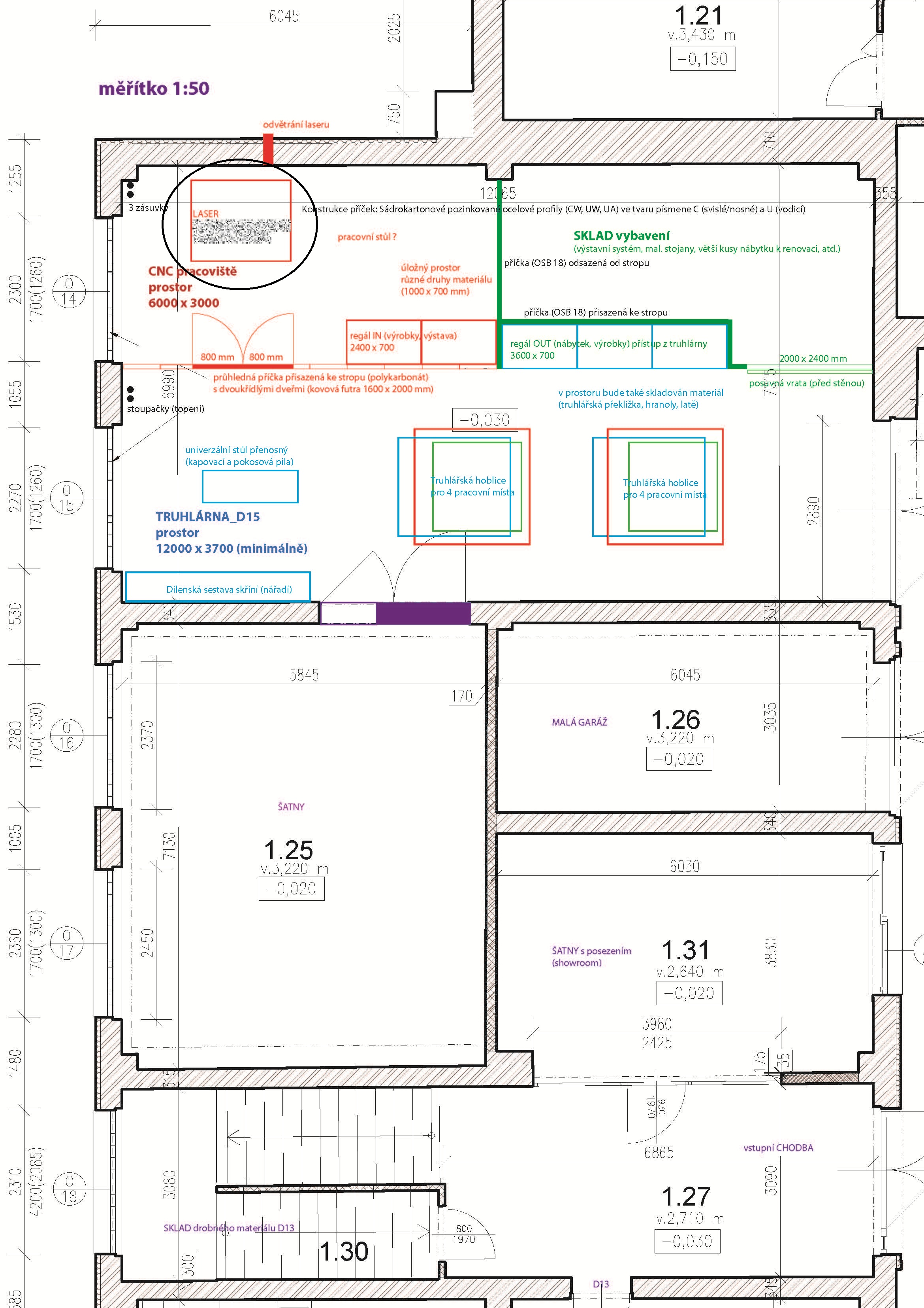 Pro umístění CNC není potřeba překonávat žádný schod. Na plánku barevně vyznačené vybavení není, jde o budoucí stav, nepřekáží tudíž v cestě. Odvětrání bude přes průraz ve zdi.